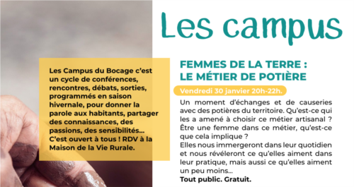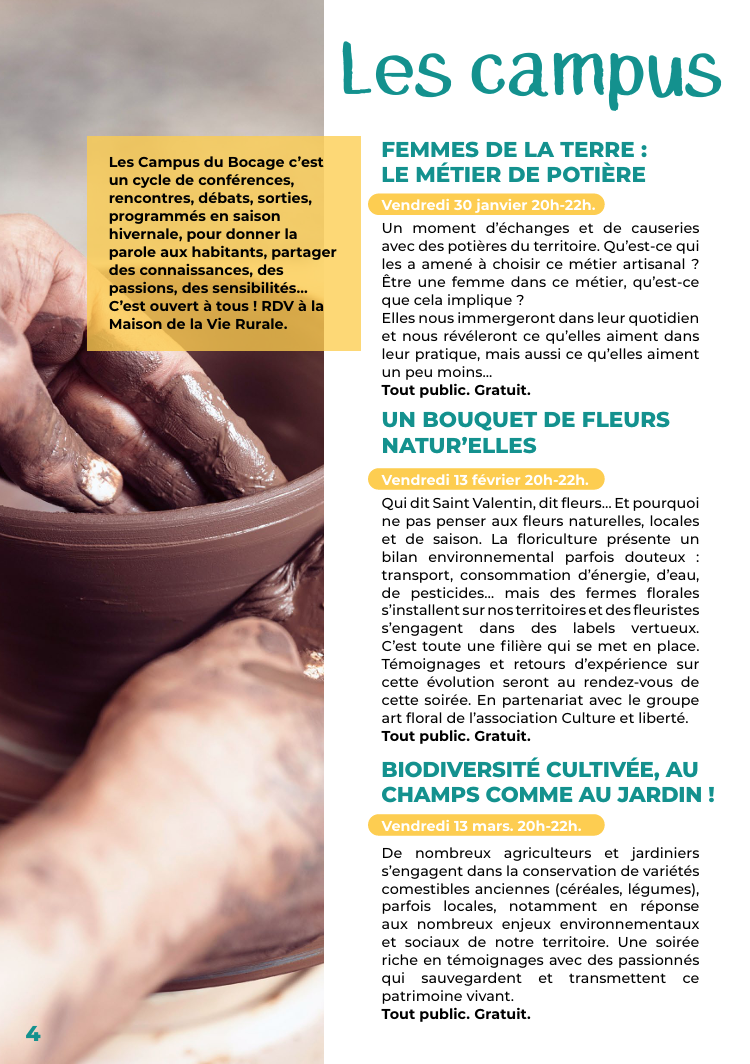 Les Campus du Bocage c’est un cycle de conférences, rencontres, débats, sorties, programmés en saison hivernale, pour donner la parole aux habitants, partager des connaissances, des passions, des sensibilités... C’est ouvert à tous et gratuit ! RDV à la Maison de la Vie Rurale.